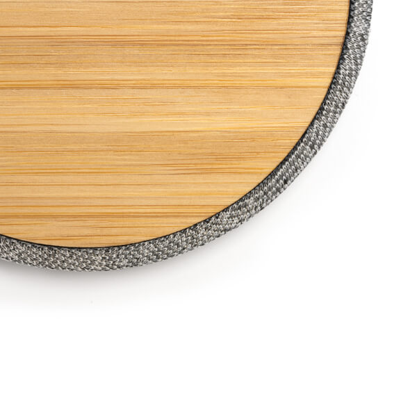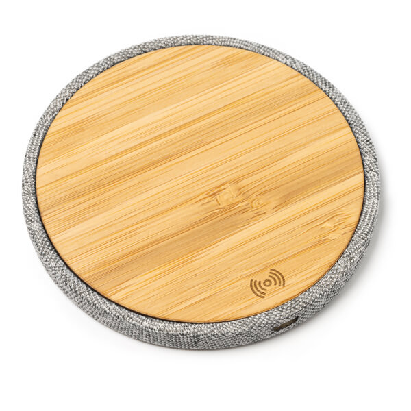 Wireless charger with main construction made of bamboo and RPET fabric, compatible with wireless technology devices. 10W output. Type-C connection. Cable included. Packaged in an eco-friendly box with a unique design.