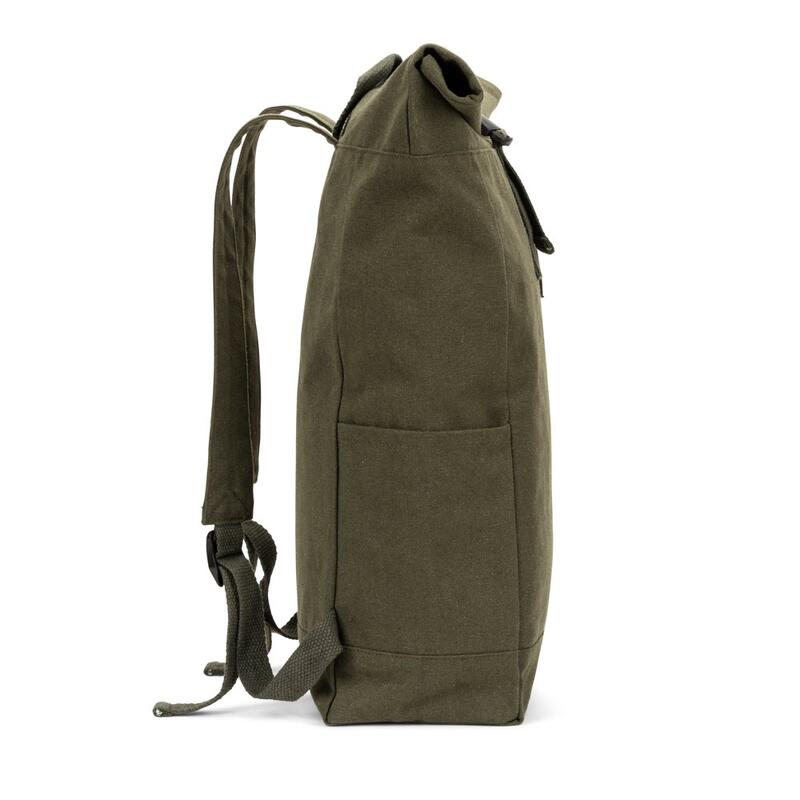 Roll-top backpack with a functional design that offers enough space and comfort to accompany you in your daily life.Outer material: Recycled cotton and recycled polyester (380 g/m²)Capacity (L): 17Compartments: 1 main compartmentExterior pockets: 1 front zippered pocket and 2 side pocketsFabric production process: The raw material is used in its original form and color, without the use of dyeing or bleaching chemicals, contributing to a lower impact. The solid color is obtained by choosing recycled yarn with the same shade, and impurities and color variations may appearDimensions: 260 x 420 x 140 mm