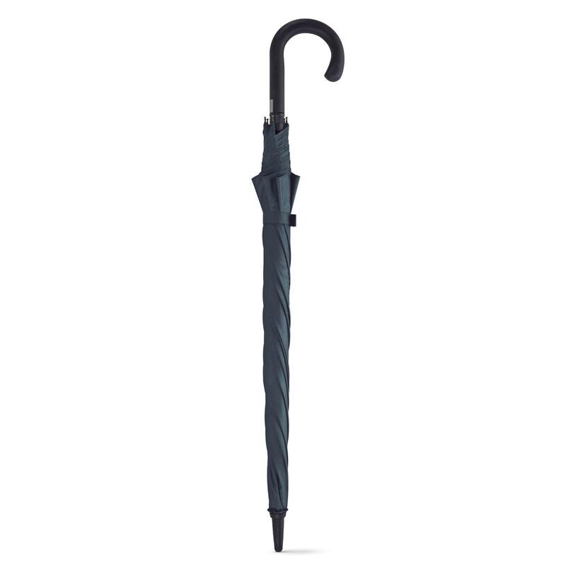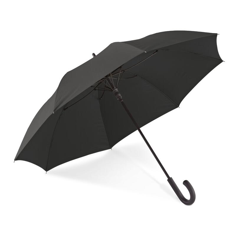 Pongee 190T umbrella with fiberglass shaft and ribs, and rubber coated handle. This umbrella is windproof and has automatic opening. ø1030 x 890 mm