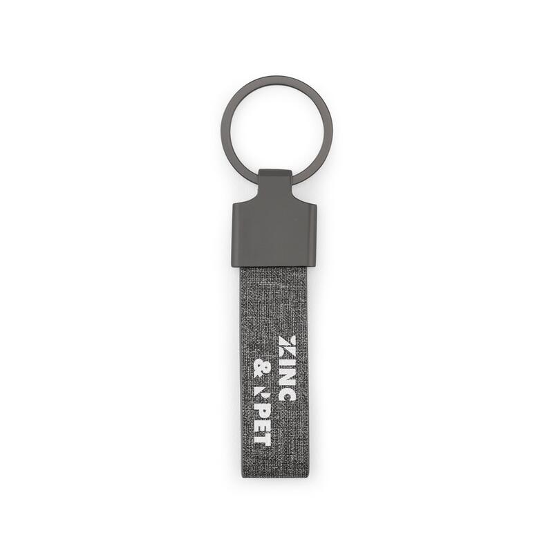 Rectangular key ring made of metal and recycled pet (30% rPET). It has a ring to make it easier to place keys and small objects. Supplied in a kraft paper pouch. 87 x 25 x 7 mm