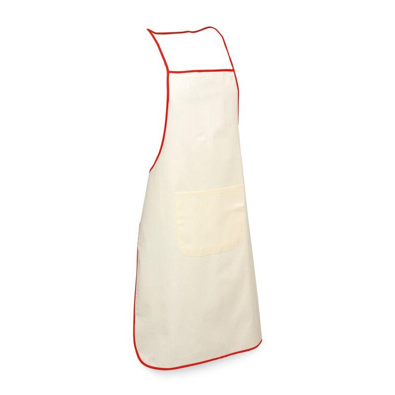 100% cotton apron (105 g/m²) with soft fabric, natural colour with coloured trim. Apron with 1 front pocket and adjustable straps. 600 x 900 mm | Pocket: 250 x 200 mm