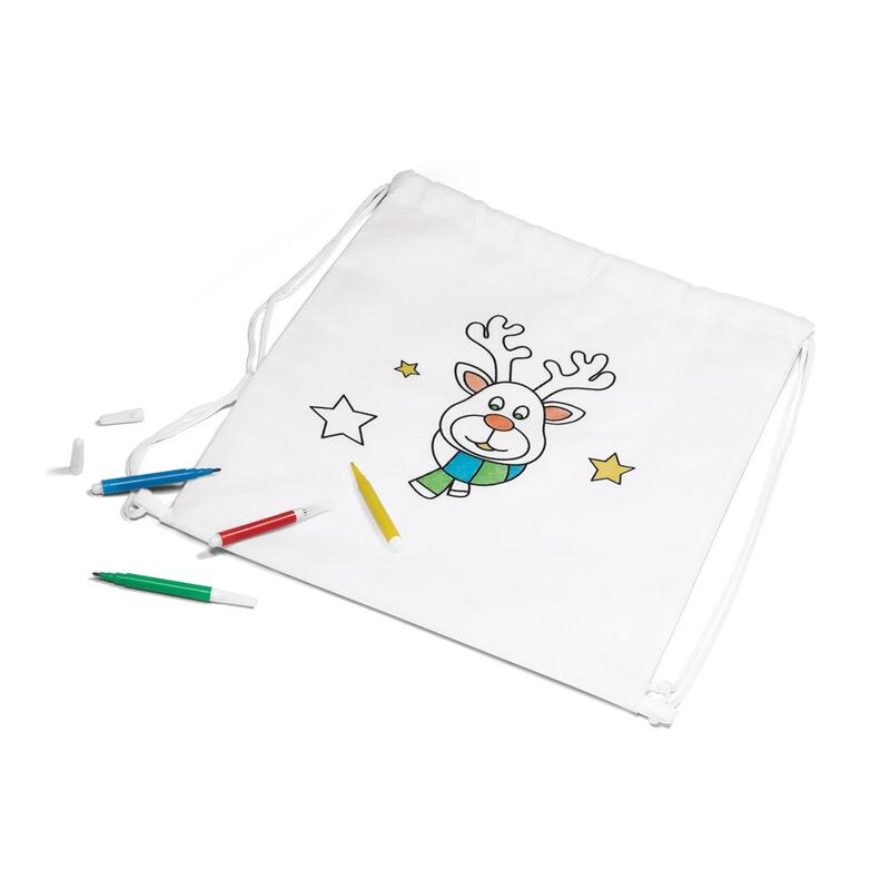 Drawstring bag in non-woven (80 g/m²) with coloring drawing and inner pocket with 4 markers included. 300x350 mm