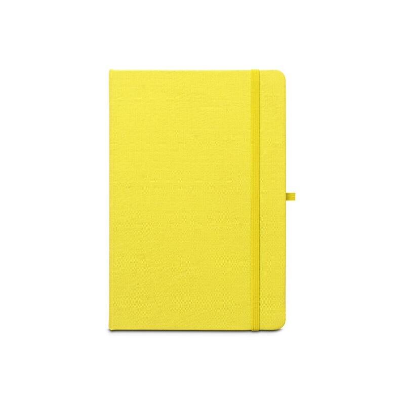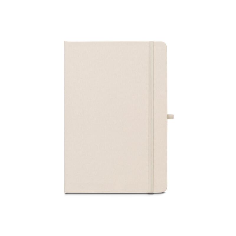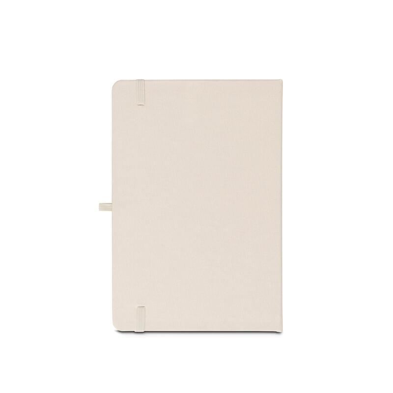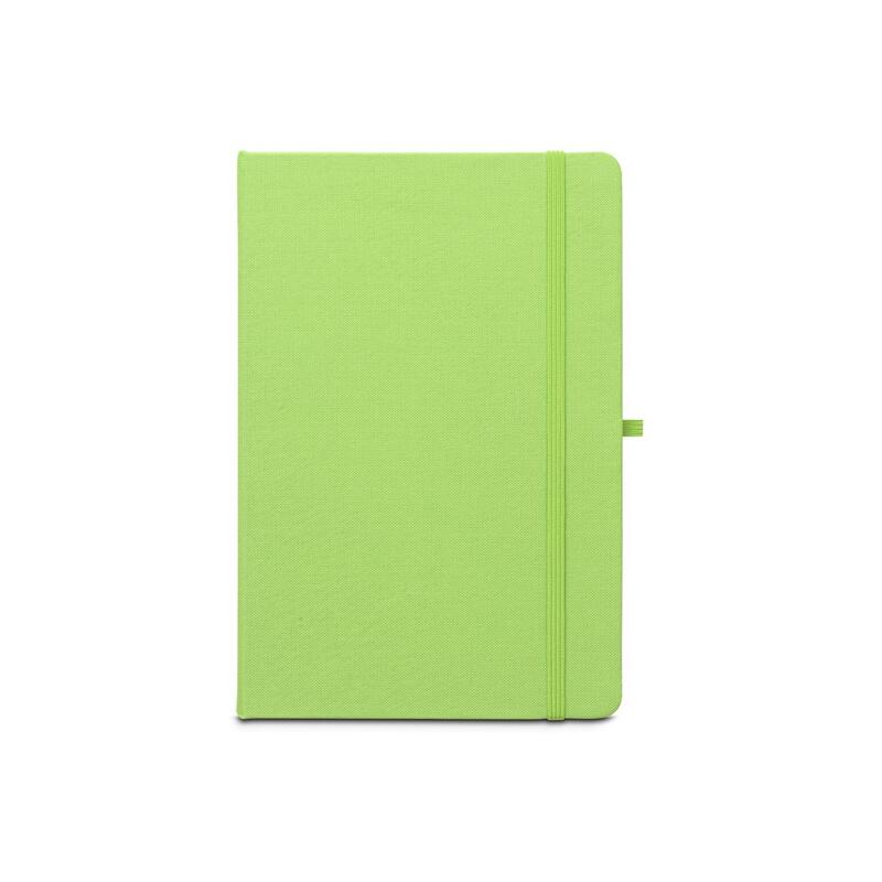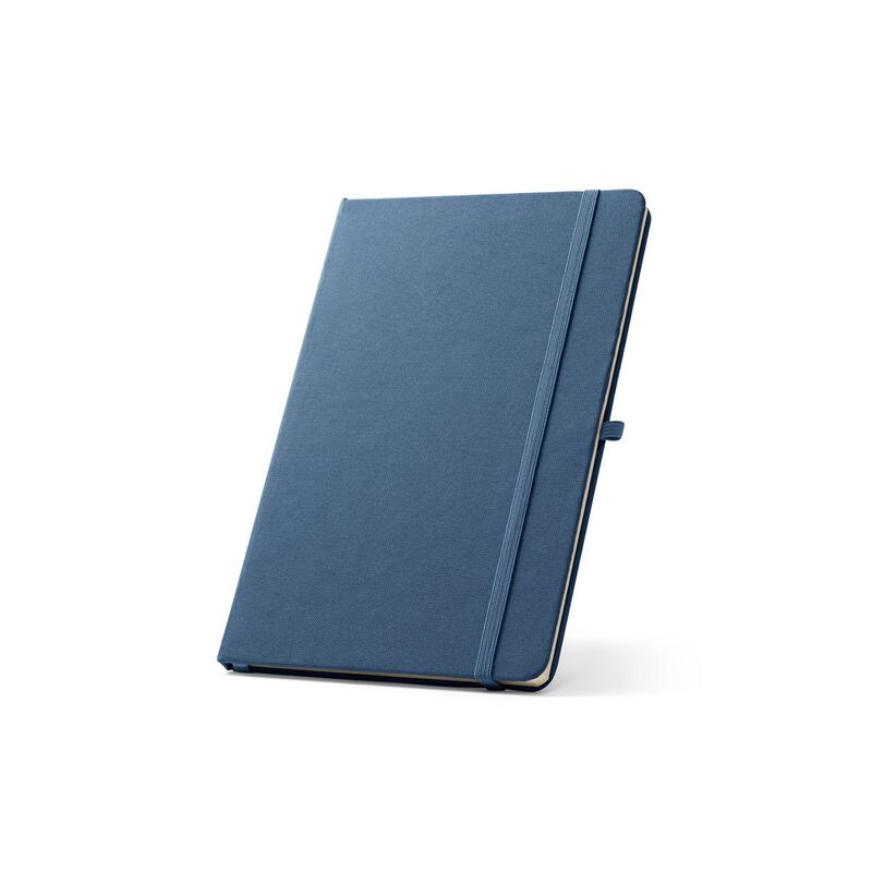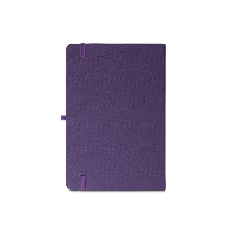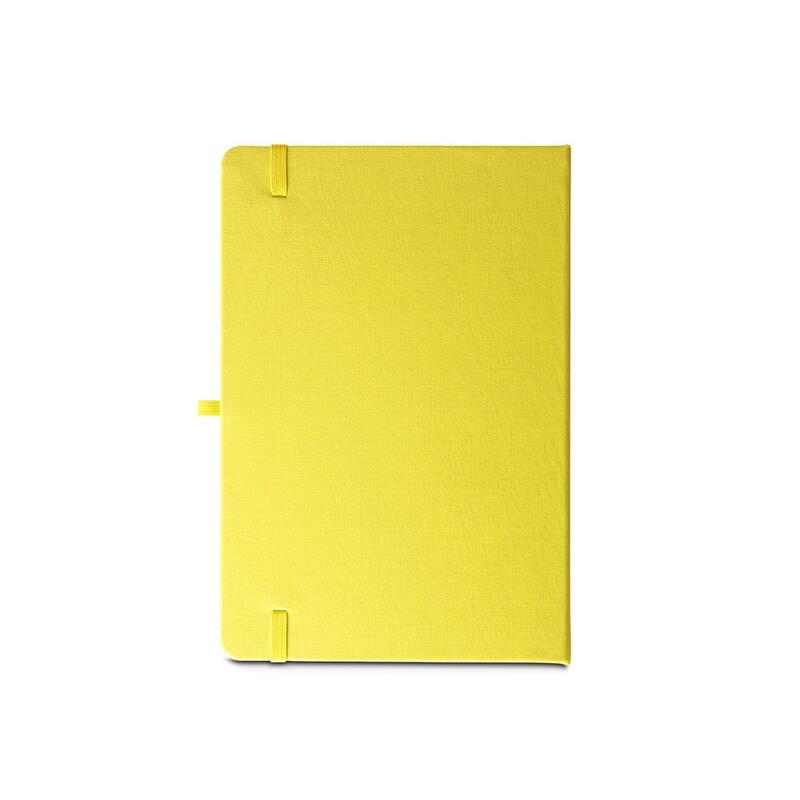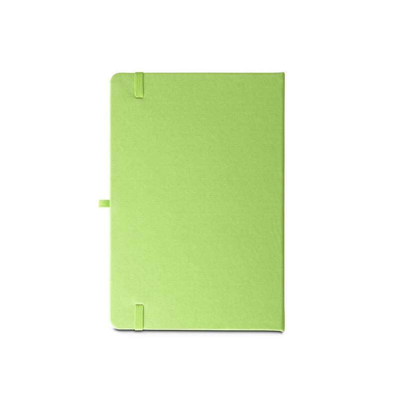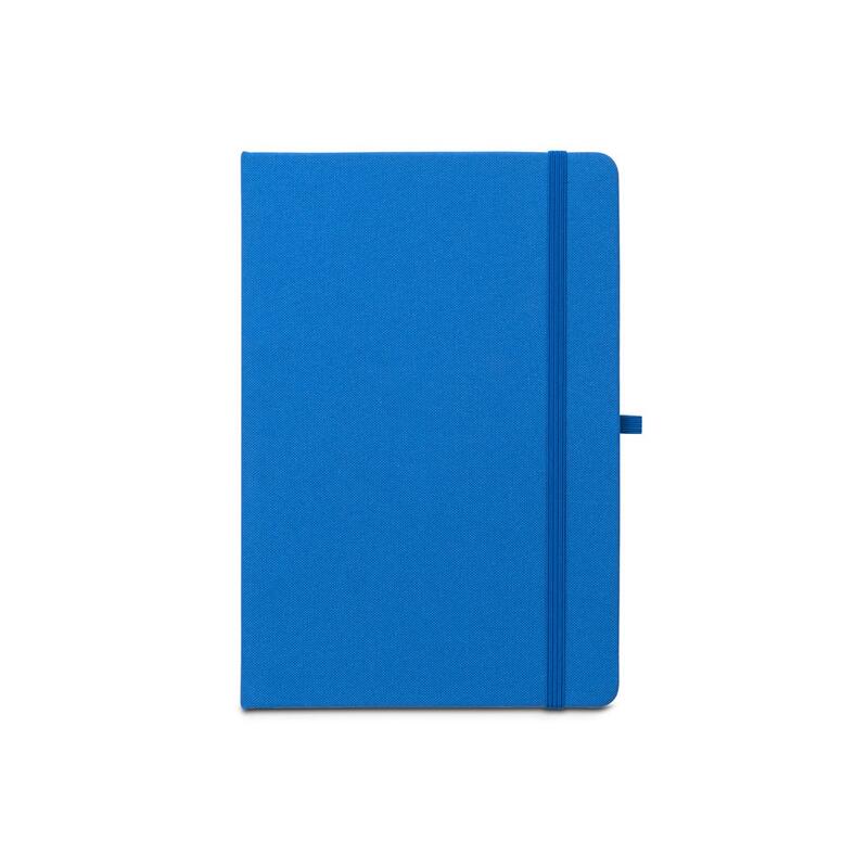A5 notebook, with a rigid cover in recycled polyester (100% rPET) 300D and rounded corners. It contains 160 lined pages in 100% recycled ivory-coloured paper (70 g/m²), a ribbon, a pen holder (pen not included) and an elastic band for closing. The rPET symbol is printed in white at the bottom of the spine. 143 x 211 mm