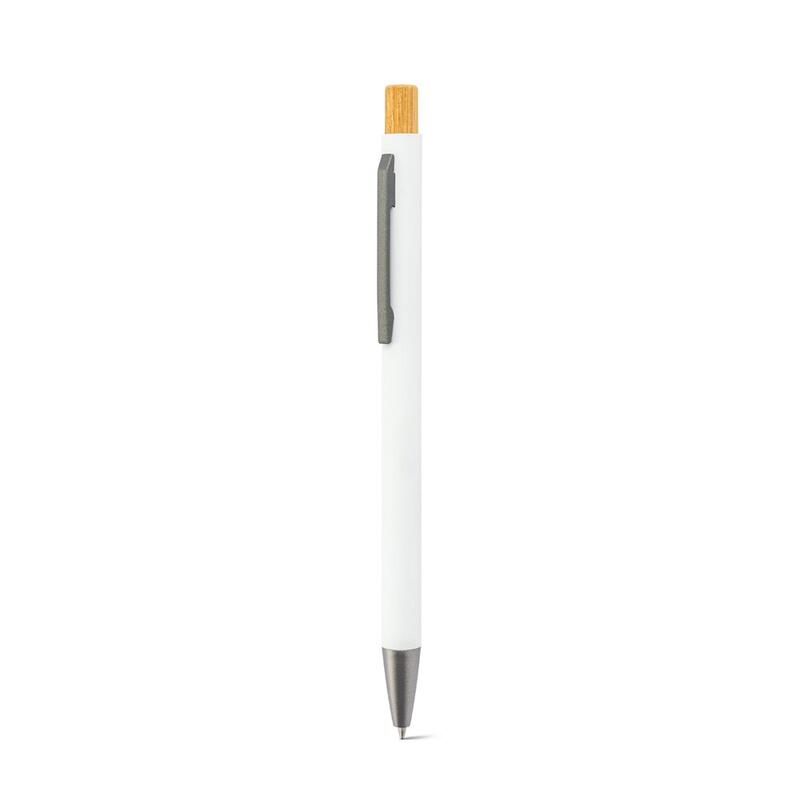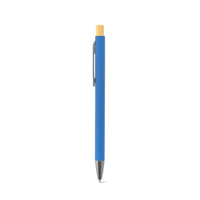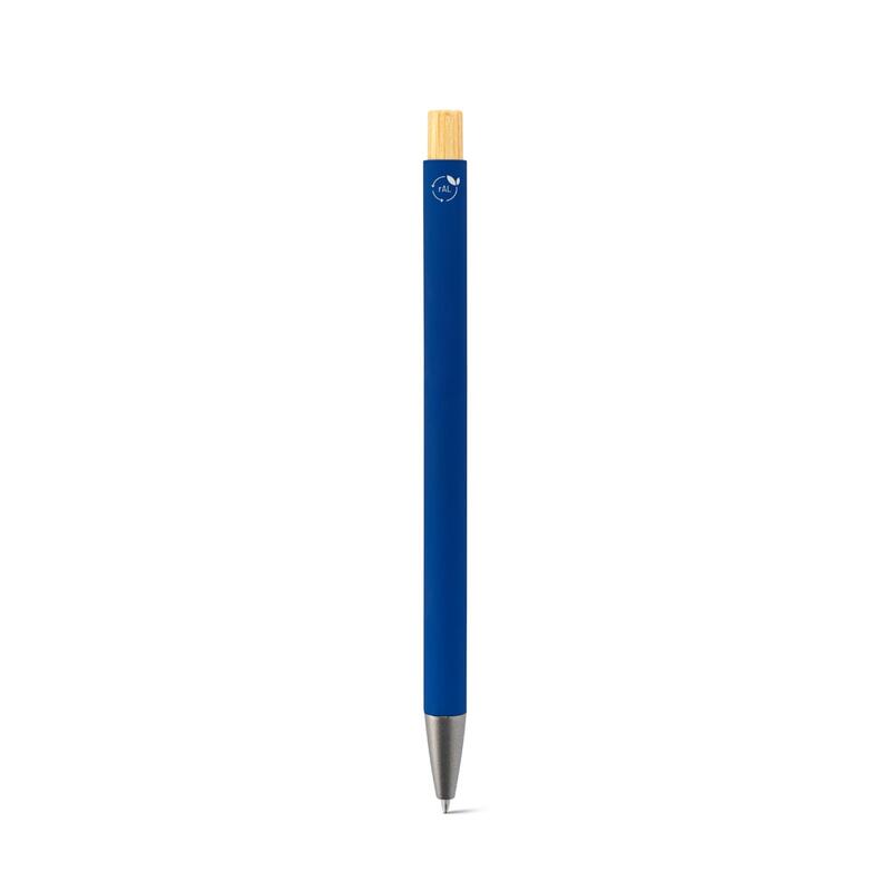 Recycled aluminum ballpoint pen (100% RAL) with a rubber finish. Its minimalist design combines matte metallic gray details and a bamboo button at the top. It features a clip and blue writing. When laser engraved, the personalization color will turn silver. As the product is made from natural materials, the colour and the printing result may vary between products. ø9 x 135 mm