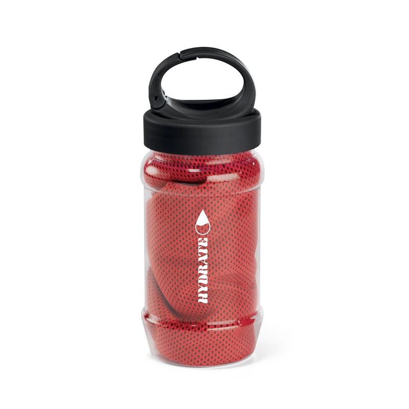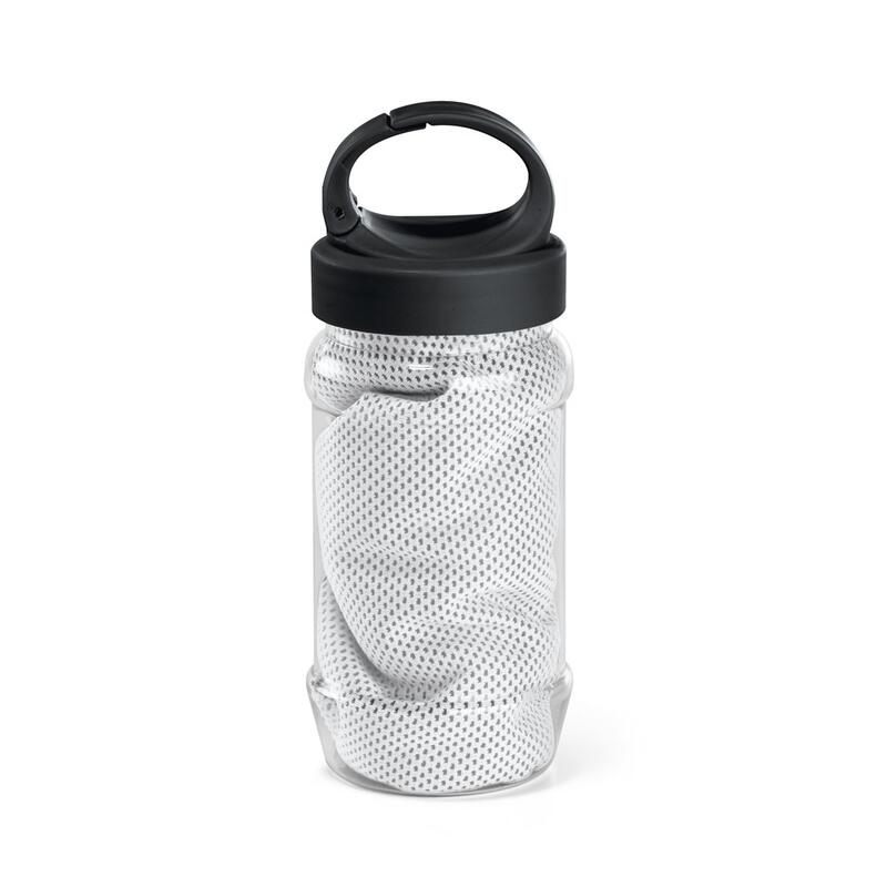 Set with a PP and PET bottle and a polyamide and polyester sports towel. Bottle with handle, practical to be taken anywhere and capacity up to 440 mL. Refreshing towel that, when wet, stays cool for a few hours. If it warms up, just shake it, reactivating its freshness. The towel is reusable and washable in the dishwasher . Towel: 300 x 800 mm | Bottle: ø65 x 183 mm