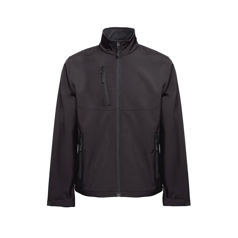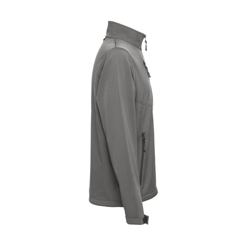 96% polyester and 4% elastane (280 g/m²) softshell jacket (unisex) with two layers and water-resistant coating. Fleece lined jacket with 2 front pockets and diagonal chest pocket, both zippers with rubber pullers. Adjustable cuffs with self-adhesive hook and loop fastener and drawstring at the hem. Sizes: XS, S, M, L, XL, XXL