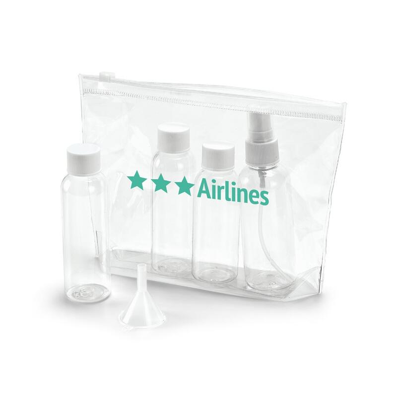 Αεροστεγής τσάντα καλλυντικών PVC που περιλαμβάνει 3 φιάλες (2 x 65 mL και 1 x 60 mL), 1 ψεκαστήρα (80 mL) και 1 χωνί. Ιδανικό για ταξίδια με αεροπλάνο. 190 x 155 x 40 mm