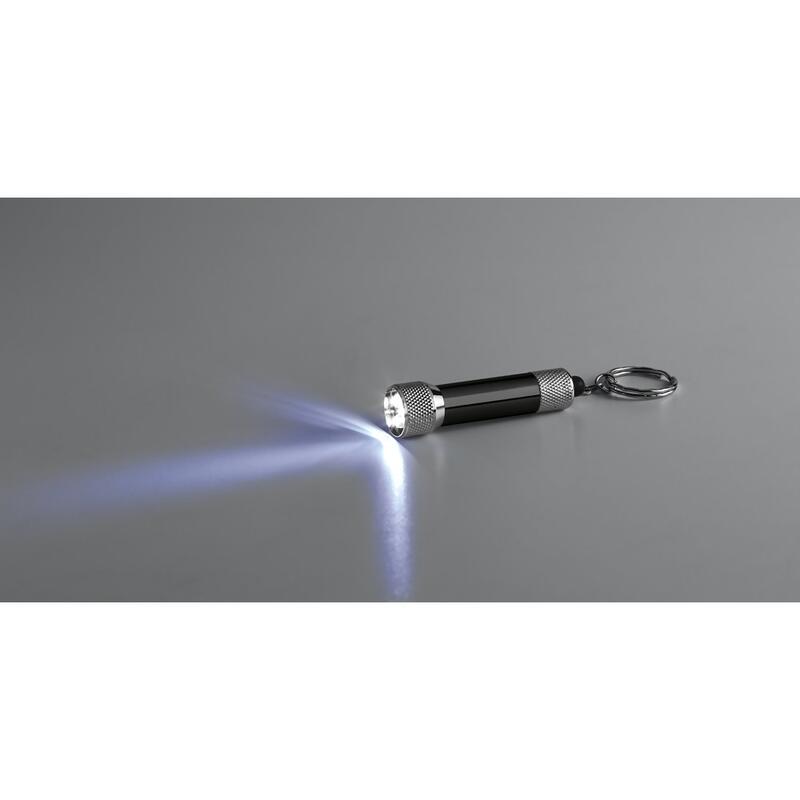Μπρελόκ από αλουμίνιο (92% ανακυκλωμένο) με φακό LED 3 φωτεινών ενδείξεων. Περιλαμβάνει 3 μπαταρίες LR44. Δαχτυλίδι: ø 25 mm | Προϊόν: ø15 x 70 mm | Αλυσίδα: 37 mm | Σύνολο: 115 x 25 x 15 mm