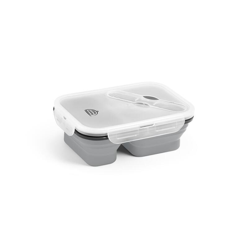 Πτυσσόμενο ερμητικό κουτί σε σιλικόνη και PP με 2 διαμερίσματα και χωρητικότητα έως 480 mL και 760 mL. Στην κορυφή του καπακιού υπάρχει χώρος για την αποθήκευση ενός κομματιού επιτραπέζιου σκεύους (περιλαμβάνεται). Τα επιτραπέζια σκεύη που περιλαμβάνονται είναι ένα πιρούνι και ένα μαχαίρι σε ένα. Κατάλληλο για χρήση σε φούρνο μικροκυμάτων (το κάλυμμα πρέπει να αφαιρεθεί). 212 x 153 x 73 mm | Διπλωμένο: 212 x 153 x 38 mm