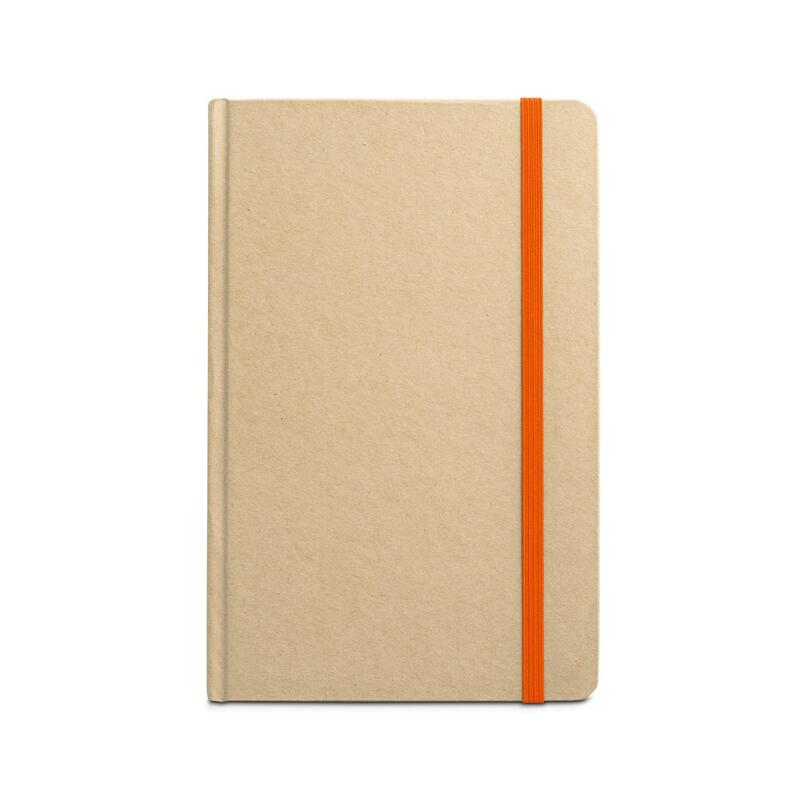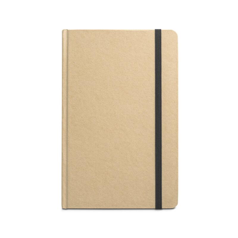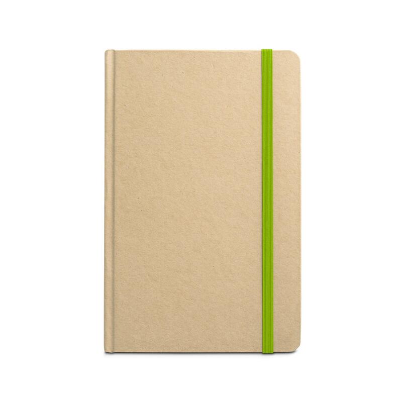 Σημειωματάριο Α5 με 160 σελίδες (60 g/m²), κατασκευασμένο από 100% ανακυκλωμένο χαρτί, και σκληρό εξώφυλλο από 100% ανακυκλωμένο χαρτί. Περιέχει κορδέλα σελιδοδείκτη και χρώμα που ταιριάζει με ελαστική ταινία. 137 x 210 mm