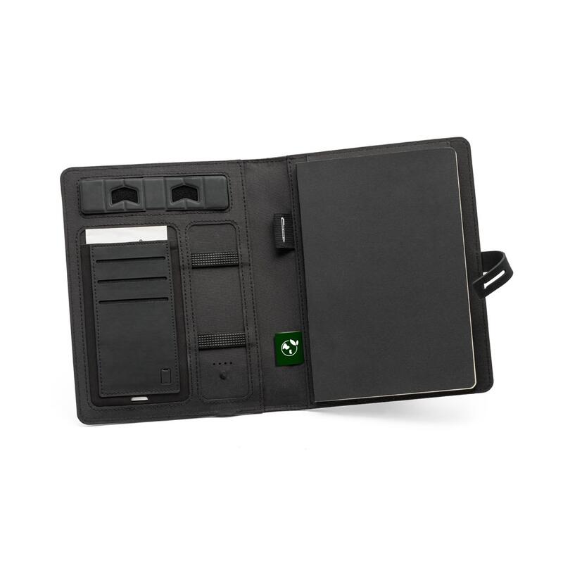 Φάκελος A5 από 300D ανακυκλωμένο πολυεστέρα (100% rPET) με ενσωματωμένο ασύρματο φορτιστή. Η μπαταρία έχει χωρητικότητα 5'000 mAh, ισχύ 5 W, είσοδο/έξοδο 5V/2'1A και καλώδιο USB τύπου C για τη φόρτιση. Ο φάκελος περιέχει μια εσωτερική θήκη smartphone για συσκευή έως 6.5'', 3 υποδοχές για κάρτες, 4 φωτάκια LED, κουμπί ενεργοποίησης/απενεργοποίησης, θήκη για στυλό (δεν περιλαμβάνεται), καλώδιο smartphone και USB, ένα σημειωματάριο με μαύρο χαρτονένιο κάλυμμα και 128 σελίδες χρώματος ιβουάρ (75 g/m²), κατασκευασμένο από πιστοποιημένο υλικό FSC™ και άλλα ελεγχόμενα υλικά. Στο μπροστινό μέρος υπάρχει επίσης μια οβάλ εκτύπωση σε μαύρο χρώμα για να υποδεικνύει την περιοχή ασύρματης φόρτισης. Διατίθεται σε κουτί. 165 x 225 x 25 mm
