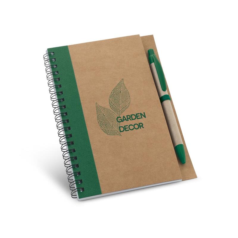 Σπιράλ σημειωματάριο B6 με 120 απλές σελίδες (55 g/m²), κατασκευασμένο από 100% ανακυκλωμένο χαρτί, και σκληρό εξώφυλλο κατασκευασμένο από 100% ανακυκλωμένο χαρτί,. Περιλαμβάνει στήριγμα για στυλό και στυλό σε 100% ανακυκλωμένο χαρτί και λεπτομέρειες ABS. 130 x 177 mm