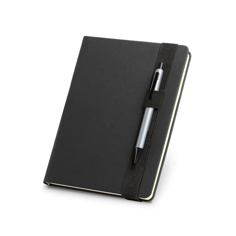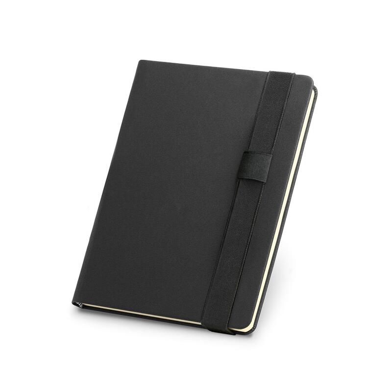 Σημειωματάριο A5 με σκληρό εξώφυλλο από PU. Αυτό το σημειωματάριο έχει 280 μονόχρωμες σελίδες ιβουάρ (70 g/m²), κατασκευασμένο από πιστοποιημένο υλικό FSC™ και άλλα ελεγχόμενα υλικά, θήκη για στυλό (δεν περιλαμβάνεται στυλό) και ελαστική ταινία. Παρέχεται σε non-woven θήκη. 145 x 210 mm | Θήκη: 185 x 240 mm