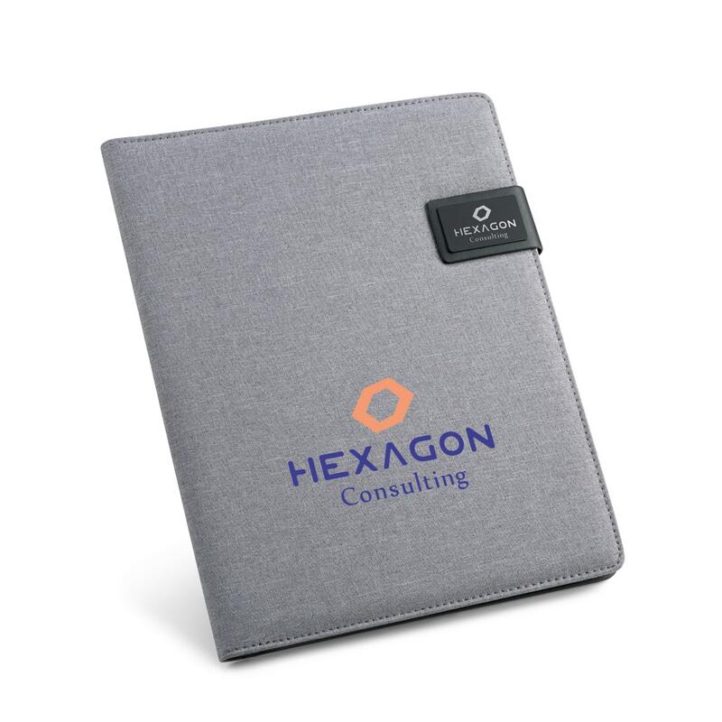 Φάκελος A4 από απομίμηση λινών και PU. Διαθέτει μαγνητικό κλείσιμο με προσαρμόσιμη πλάκα, ένα μπλοκ 40 γραμμωμένες σελίδες (60 g/m²), θήκη για στυλό (το στυλό δεν περιλαμβάνεται), θήκη για smartphone και στηρίγματα για καλώδια ή άλλα αξεσουάρ (δεν περιλαμβάνονται). 233 x 310 x 18 mm | Ταμπελάκι: 50 x 30 mm