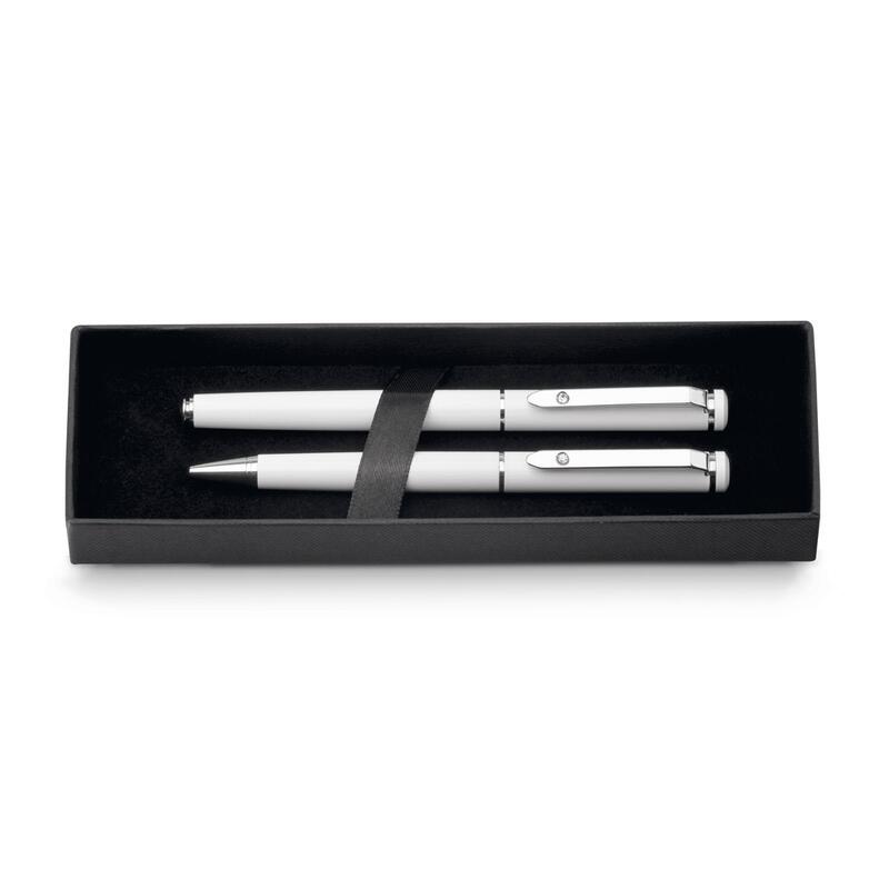 Σετ στυλό με μηχανισμό περιστροφής και μεταλλικό κλιπ και ρολό με γυαλιστερή λεπτομέρεια στην άκρη. Μπλε μελάνι. Παραδίδεται σε παραγεμισμένο κουτί δώρου. Στυλό: ø10 x 133 mm | Roller: ø10 x 137 mm | Κουτί: 180 x 57 x 25 mm