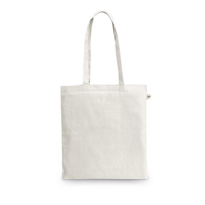 Τσάντα από ανακυκλωμένο βαμβάκι (70%) και πολυεστέρα (30% rPET) (150 g/m²), με χειρολαβές 65 cm. Το ανακυκλωμένο βαμβάκι είναι μονόχρωμο και άβαφο. Η πρώτη ύλη χρησιμοποιείται στην αρχική της μορφή και χρώμα, χωρίς τη χρήση χημικών ουσιών βαφής ή λεύκανσης, συμβάλλοντας έτσι στη μείωση των ρύπων. Το μονόχρωμο χρώμα επιτυγχάνεται με την επιλογή ανακυκλωμένων νημάτων με την ίδια απόχρωση και ενδέχεται να εμφανιστούν προσμίξεις και χρωματικές διαφοροποιήσεις. 380 x 420 mm