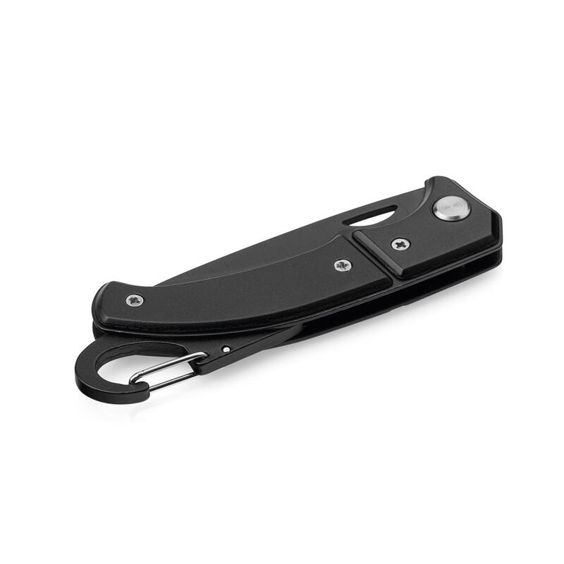 Σουγιάς τσέπης από αλουμίνιο, λεπίδα από ανοξείδωτο ατσάλι με κούμπωμα ασφαλείας και καραμπίνερ. Διατίθεται σε συσκευασία δώρου. 101 x 10 x 29 mm | Κουτί: 108 x 39 x 15 mm
