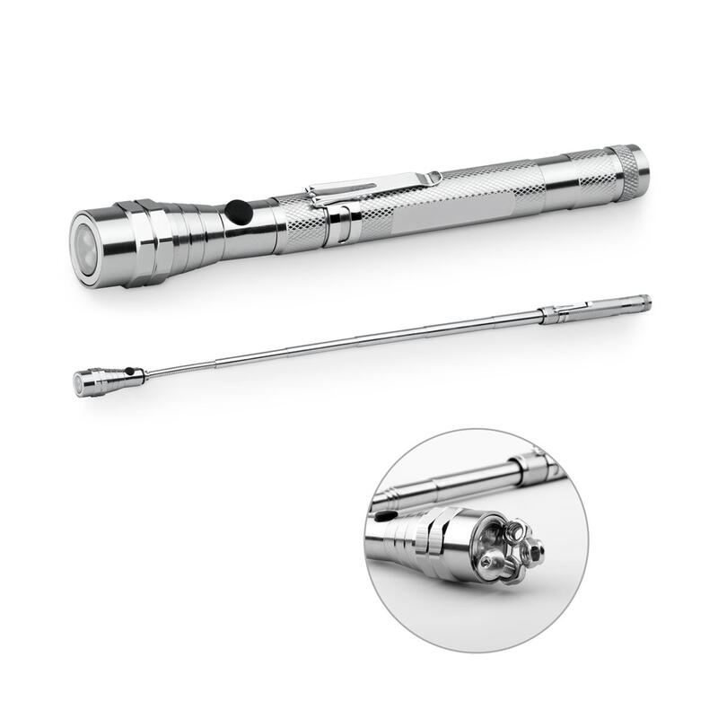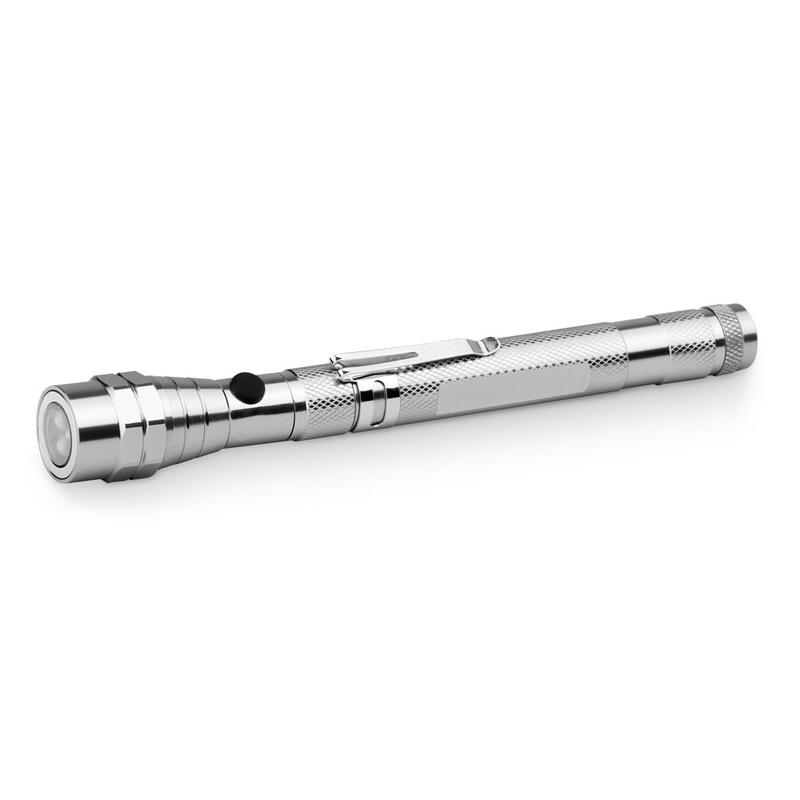 Επεκτάσιμος και εύκαμπτος μεταλλικός φακός LED με 3 LED (13 lumens), μαγνήτη στην άκρη και κλιπ. Περιλαμβάνει 4 μπαταρίες λιθίου LR44. Διατίθεται σε κουτί. ø22 x 175 mm | Κουτί: 25 x 25 x 174 mm