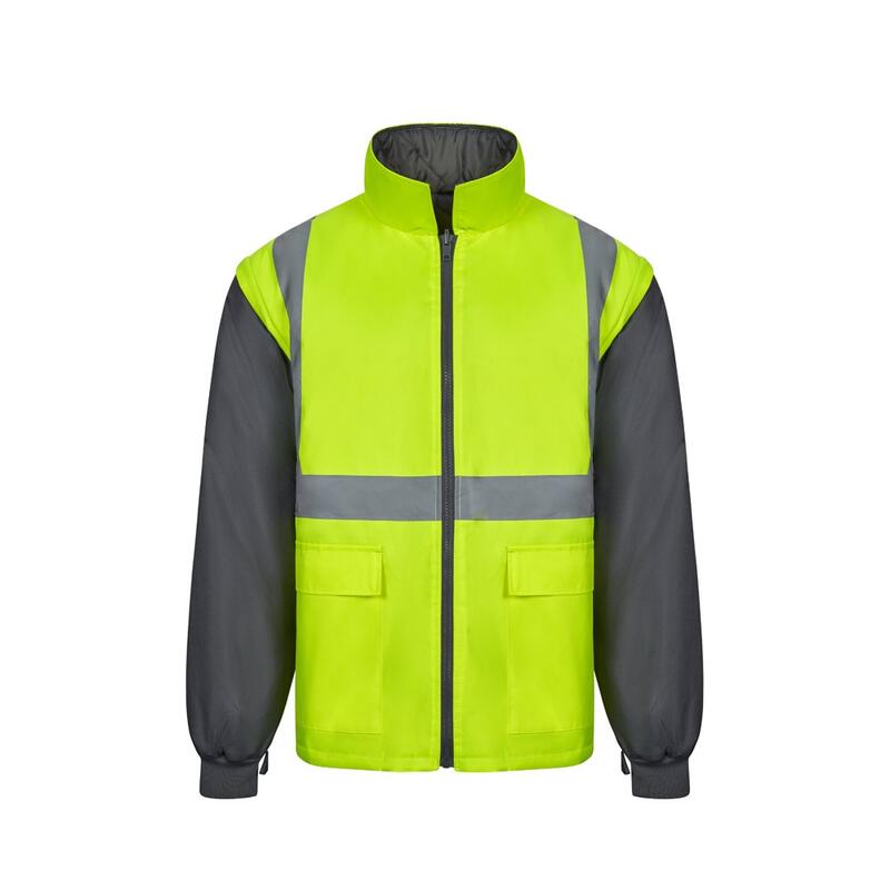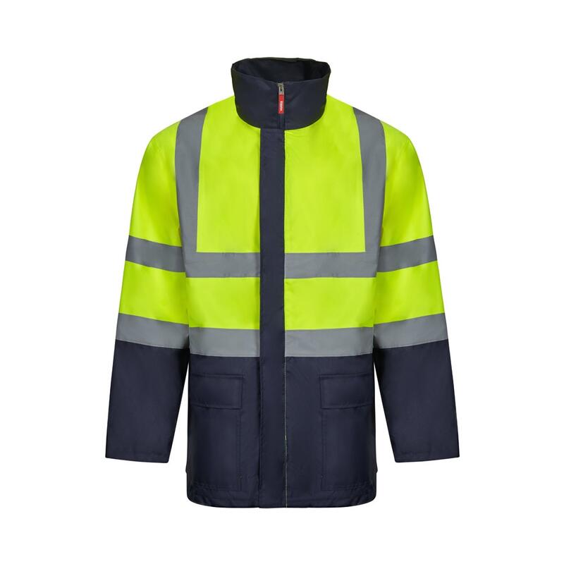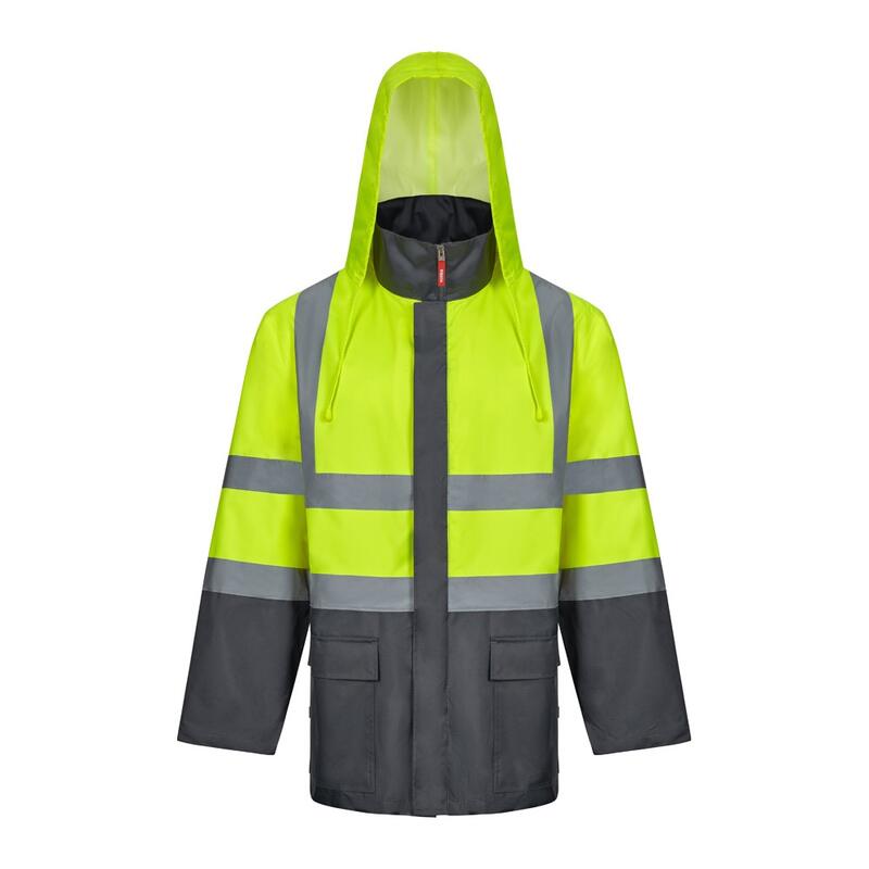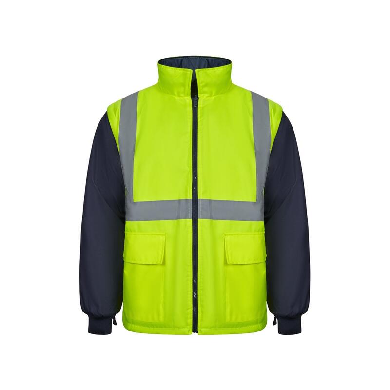 Δίχρωμο παρκά 4 σε 1 (180 g/m²), από πολυεστέρα (100%) με επίστρωση PU. Τέσσερα κομμάτια σε ένα: παρκά, αδιάβροχο, τζάκετ και γιλέκο. Πάρκα/αδιάβροχο: με κρυφό κεντρικό φερμουάρ με πατιλέτα, που κλείνει με γάντζο και θηλιά, ανακλαστικές ρίγες στον κορμό, τους ώμους και τα μανίκια και κρυφή κουκούλα. με δύο κάτω τσέπες. Μπουφάν/γιλέκο: με κεντρικό φερμουάρ, αντανακλαστικές ρίγες στον κορμό και στους ώμους, ριμπ μανσέτες και αποσπώμενα μανίκια. Με τρεις τσέπες (2 κάτω τσέπες και 1 εσωτερική τσέπη). Προϊόν σε συμμόρφωση με τον Κανονισμό ΕΕ. 2016/425, πιστοποιημένο με EN20471 και κλάση Nº 2. Μέγεθος: S, M, L, XL, 2XL, 3XL