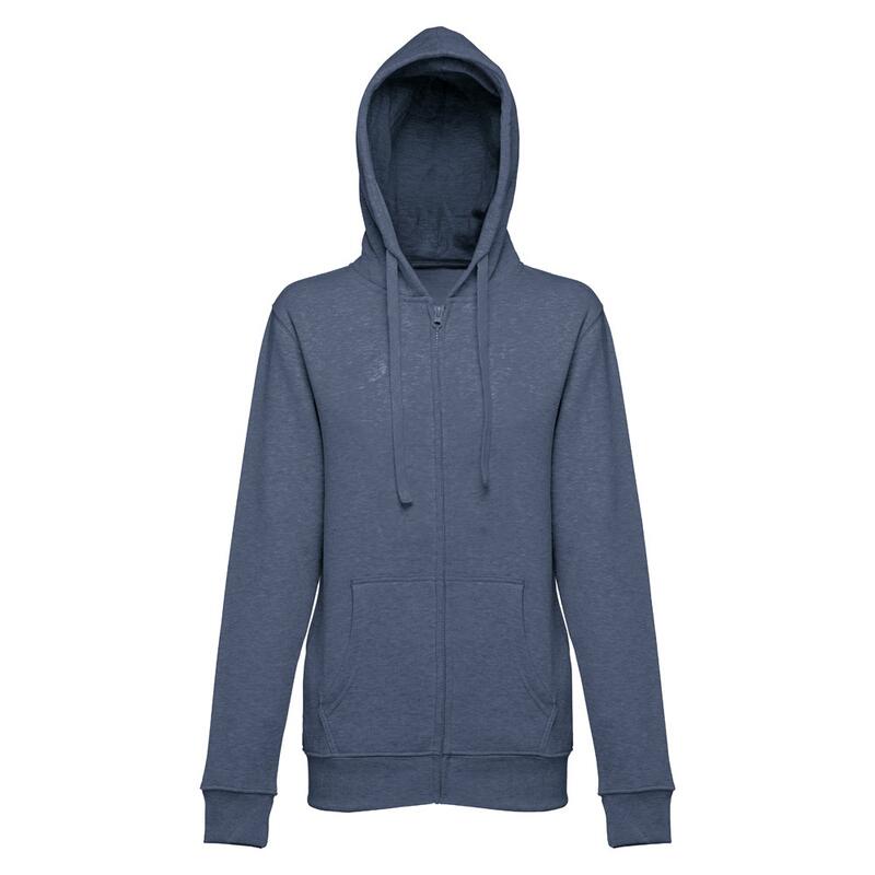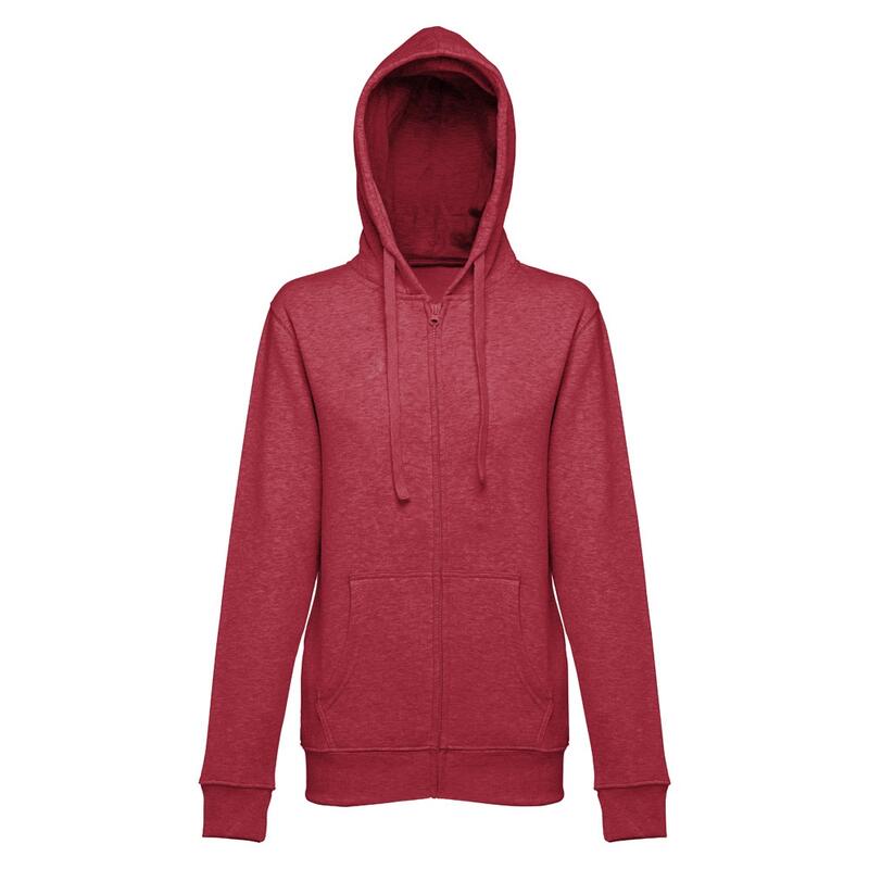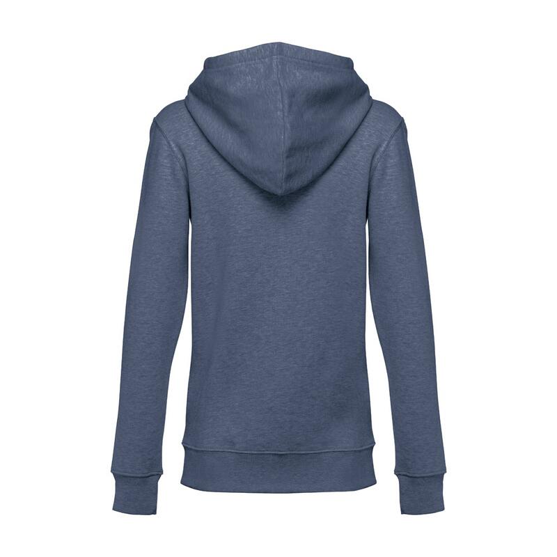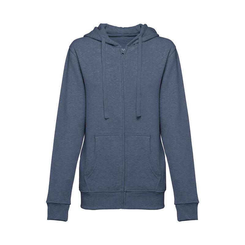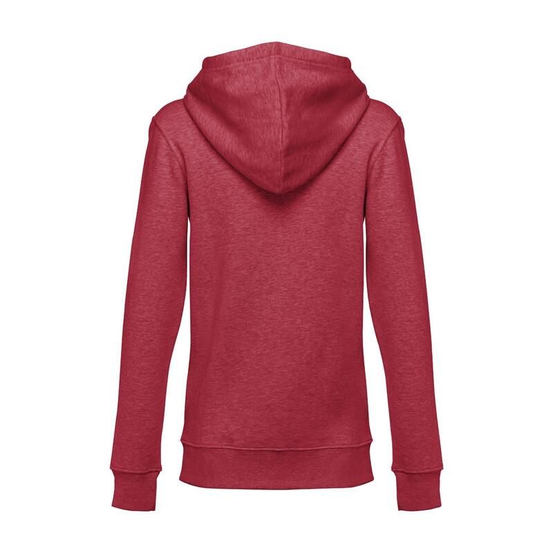 Γυναικεία μπλούζα από 50% βαμβάκι και 50% πολυεστέρα (320 g/m²) με λαναρισμένο εσωτερικό. Η κουκούλα είναι επενδυμένη και έχει κορδόνι ίδιου χρώματος. Η μπροστινή περιοχή έχει δύο μαρσπιέ τσέπες με πλαστικό κάλυμμα. Κομμάτι με μανσέτες και κορδέλα στη μέση. Μέγεθος: S,M,L,XL,XXL